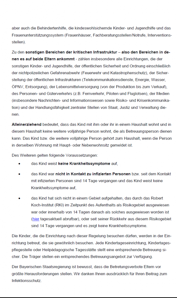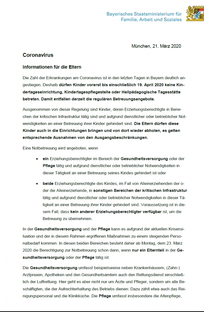 im Anschluss finden Sie die neuesten Informationen bezüglich der Notbetreuung in den Kindertagesstätten. Da sich die Nachrichten gefühlt überschlagen und wir unsere Homepage nicht immer auf dem aktuellen Stand halten können, empehlen wir Ihnen immer mal wieder auf der Seite des „Bayerischen Staatsminesterium für Familie, Arbeit und Soziales“ unter https://www.stmas.bayern.de/ nachzusehen, was es Neues gibt